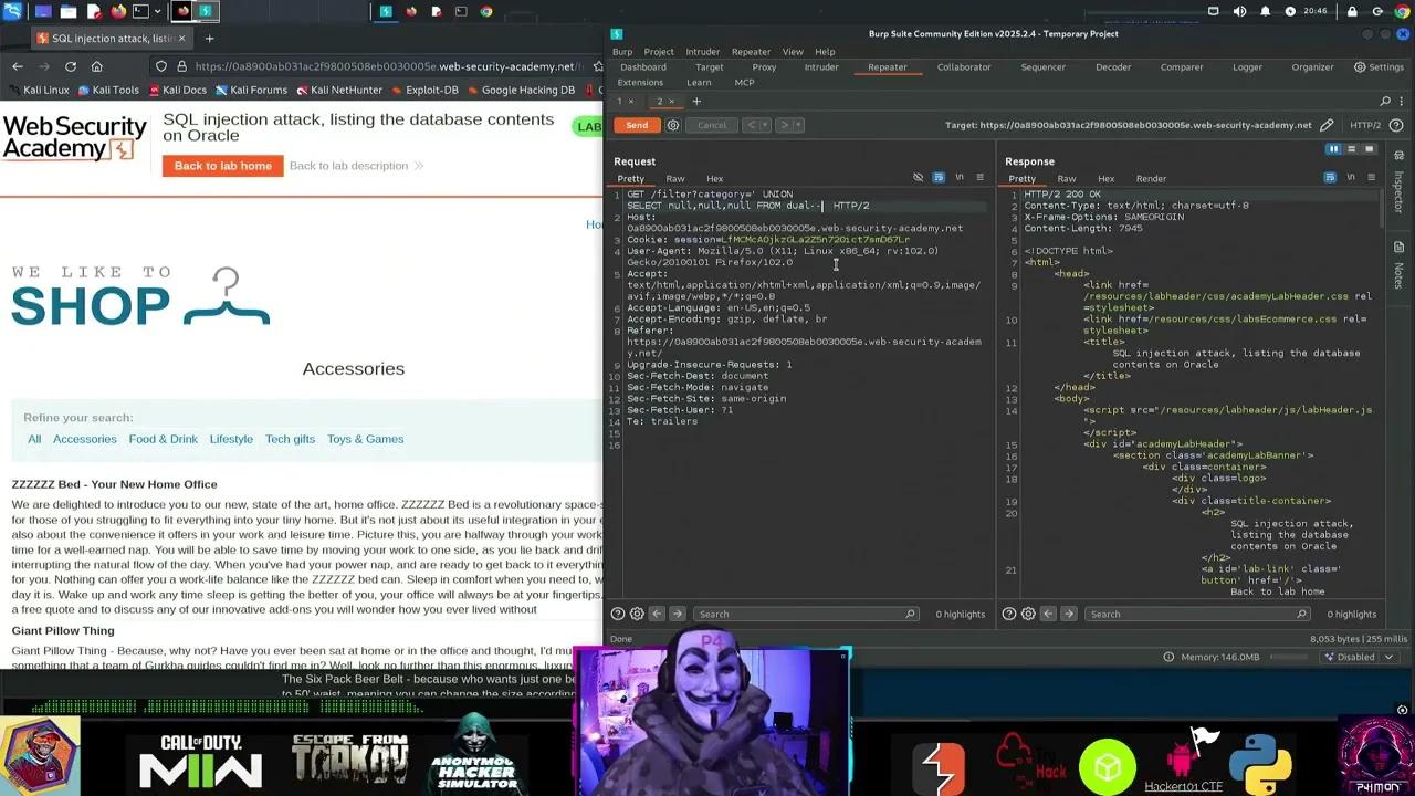 6 - ♒️ P4IM0N 🟧 PortsWigger 🟧🤮 BURPSUITE 🤮 Ataque UNION d inyección SQL, listando contenido de DB no Oracle
